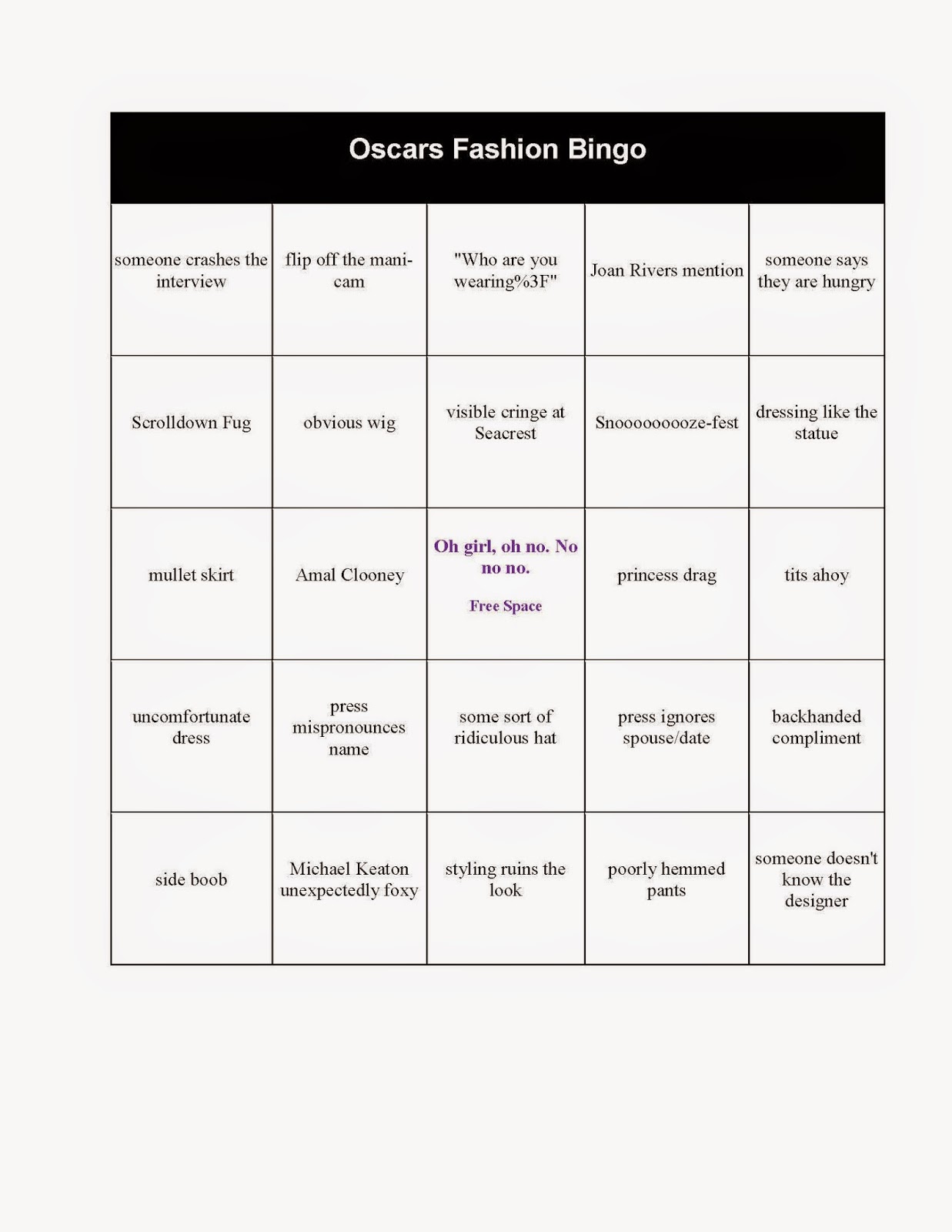 OSCARS FASHION BINGO